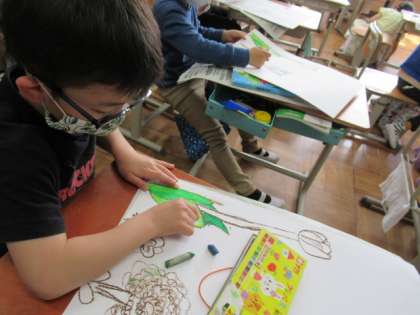 葉っぱや花の色をよく見て,2色色を重ねて塗るなど,それぞれ工夫しながら描きました。
