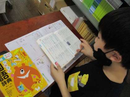 漢字学習ノートを進めるとき,国語辞典を片手に習った漢字を使う言葉やその例文を見て,学習しています。