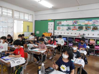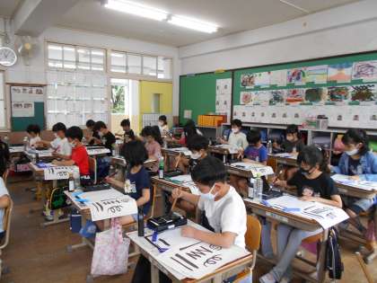 生まれて初めて墨・筆を使うという児童が多く,みんなドキドキわくわくな様子でした。