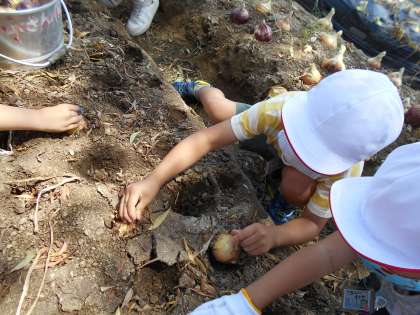 学校の畑で育った玉ねぎの収穫を体験しました。