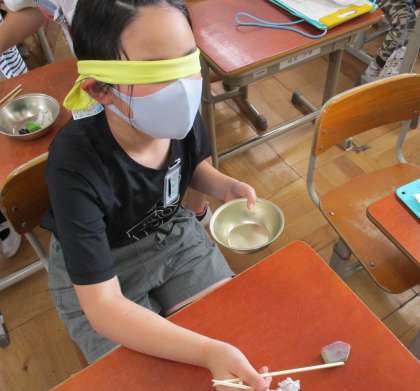 アイマスクをした状態で,スポンジやクリップなどをお箸でつかむ体験をしました。
