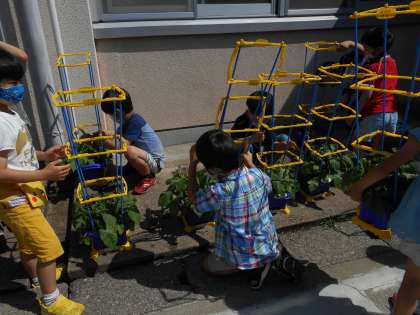 つるが伸びてきたので,支柱を立てました。