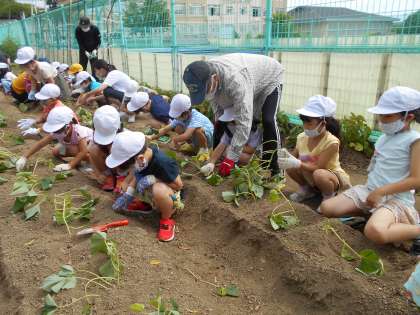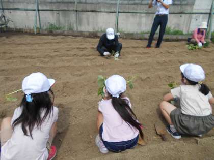 月曜日には,タマネギの収穫体験をさせていただき,今日は,さつまいもの苗植えをさせていただきました。