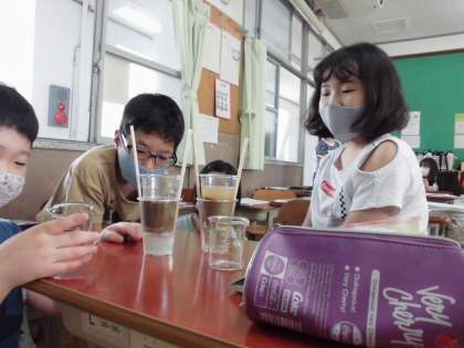 今日は,子どもたちが,雨降りの校庭の様子を見て,一番疑問に思った,「しみこむと思うけど,なぜ校庭と砂場で様子がちがったのか。」という点を詳しく調べました。
