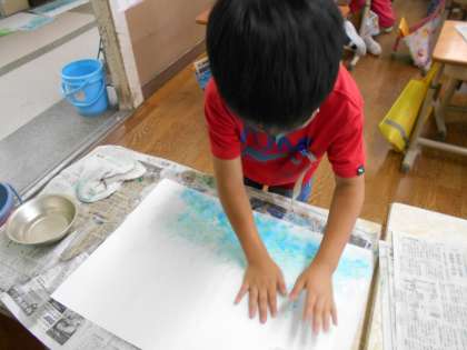 色をつけたい部分に水をつけ,手に乗せた3色の絵の具を混ざり切らないように混ぜ,画用紙に「とんとん」していきました。