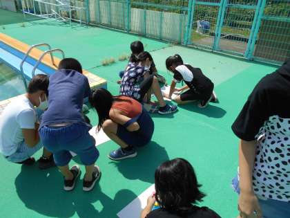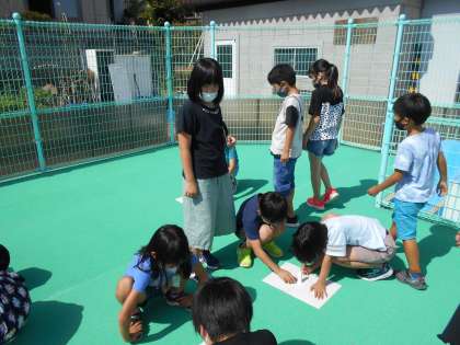 今日は,秋晴れ!プールサイドで時間ごとにかげの観察をしました。