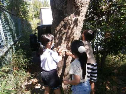 いろいろな木のまわりの長さをはかった後は,誰かが