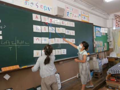 セラ先生が発音したアルファベットを2チームに分かれて,指します。