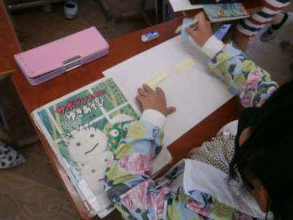 図書室で1年生に読んであげたい絵本を選んだ3年生。