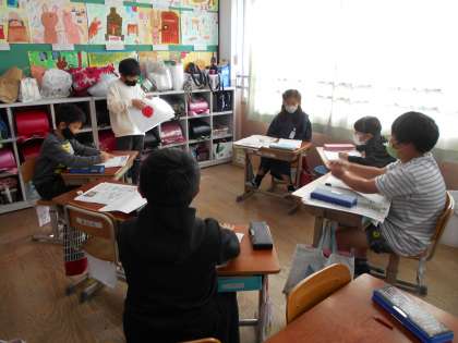外国語活動で4つのグループに分かれて自己紹介をしました。