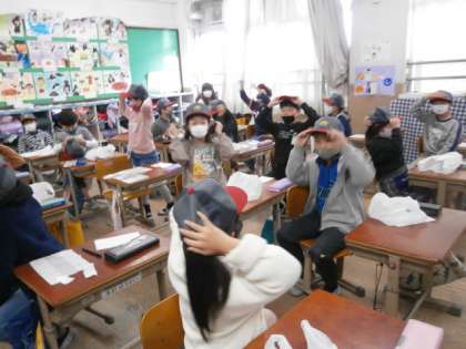 朝会で校長先生から帽子を見せてもらっていた子どもたちは