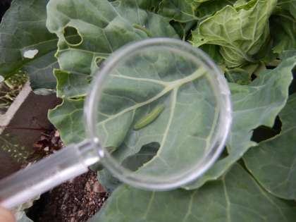 キャベツに穴がたくさんあいているので,「虫に食べられたのではないか。」と予想しました。そこで,よく見てみると,,