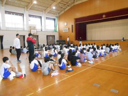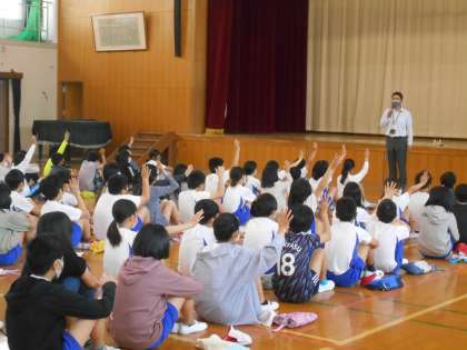 6年生は体育館で話の聞き方のお手本のように,ピシッとした姿勢でのぞんでいました。