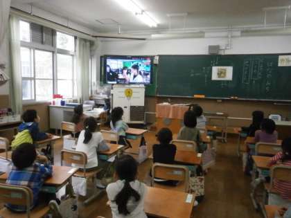 6年生が,オンラインで「こんにちは!」と言ってくれるたびに,大喜びで手をふって「こんにちはー!」と言う1年生。