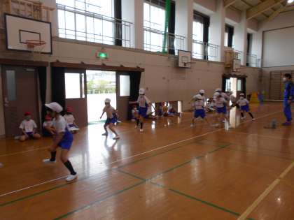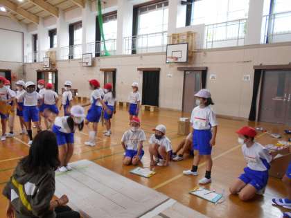 雨天のため体育館で,立ち幅跳び・上体起こし・反復横跳び・ちょう座体前屈を行いました。