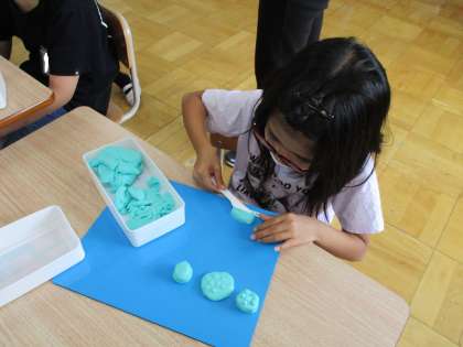 粘土を丸めたり,伸ばしたりして柔らかくした後,思い思いに好きな食べ物を作りました。