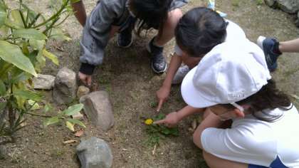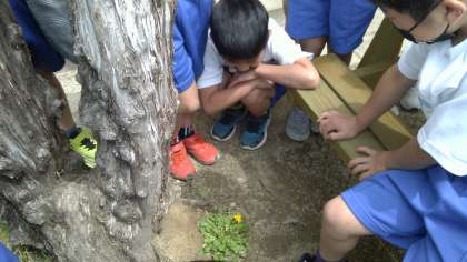 早く授業が終わったので,校内にあるたんぽぽを探しにいきました。一つ目のちえである,「花のじくをじめんにたおしている」たんぽぽを見つけました。