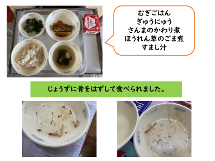 ☆煮魚は骨があります。教室で骨の外し方を確認しながら食べました。「じょうずに骨を外せたよ!」とお皿を見せてくれました。