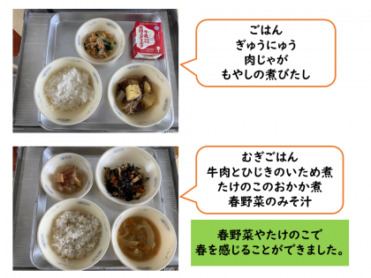 ☆焼肉の「ピーマン」は苦手に感じる子が多いため,調理員さんたちが「これぐらいの大きさなら食べやすいかな?」「少しでも苦みがやわらぐように…」と工夫して調理してくださいました。教室では子どもたちが「ピーマン食べられたよ!」「肉と一緒に食べるとおいしかった」と教えてくれました。
