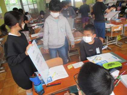 子どもたちは今まで学習してきたことを生かしながら,図や式を使って説明を行っていました。グループでの話合いがとても上手になってきました。ここからさらに広げていけたらと思います。