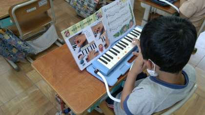 音楽の時間に鍵盤ハーモニカの練習を頑張っています。