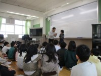 写真は,ポインティング・ゲームで楽しく日課の言い方を言ったり聞いたりして慣れ親しんでいるところです。