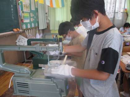図画工作科の学習では,電気糸のこぎりを使って伝言ボードを作っています。