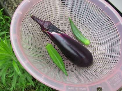 この日は,なすび1本,おくら2本を収穫することができました。