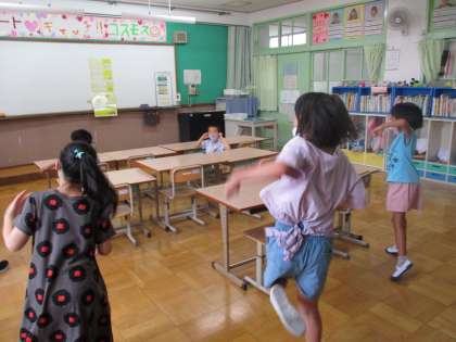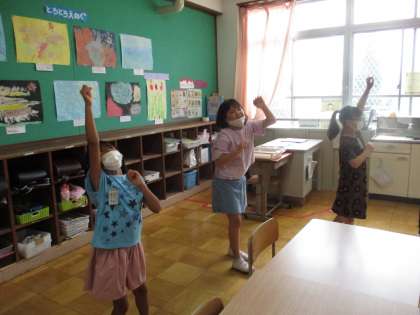 毎日の朝の会では健康観察やスピーチに加え,歌やダンスをしています。