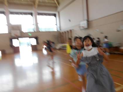 1学期がんばったね会の第1部は体育館【ふえおに】と【雪合戦】をしました。