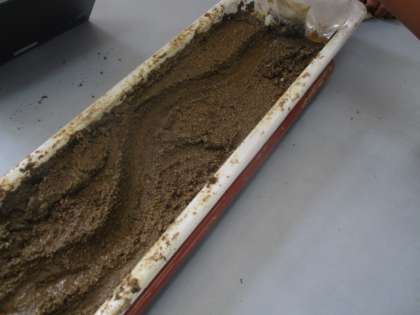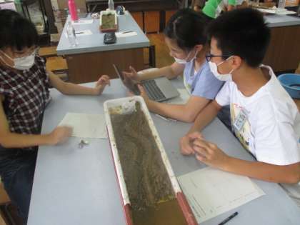 実験器具を使って、流れる水の働きを学習しています。
