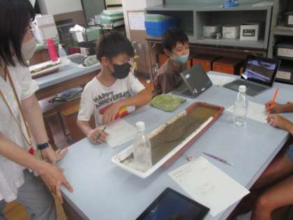 子どもたちは、砂が削れていく様子やカーブでの水の流れ方を動画に撮りながら観察をしていました。