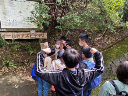 ?先程までの雨が上がり、太陽が出てきました。スコアオリエンテーリング、スタートです。班で、相談をして問題を解いています。