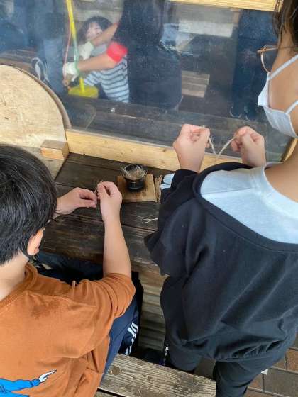 山の家の職員さんの話を真剣に聞いてスタートです。感謝の気持ちを込めて、みんなで協力して火をつけよう。ファイヤ〜。