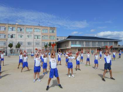 秋空のもと,運動会にむけて,よさこいソーランの練習に励む4年生。