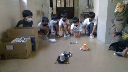 完成したら、廊下で友達と競争させながら遊んでいました。