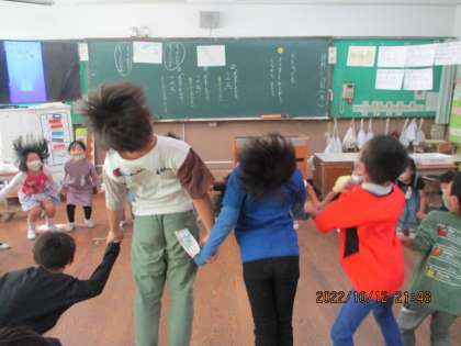 今日は、お話のなかの1年生の気持ちになって、「天までとどけ、一、二、三。」と言いながら、ジャンプしました。