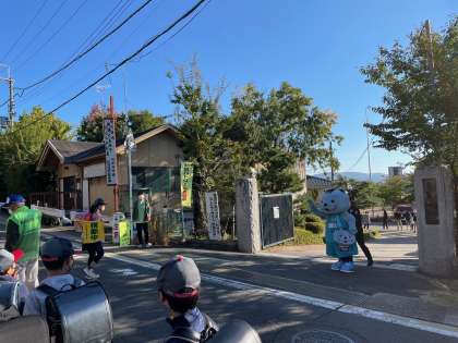 今日は正門でのあいさつ運動。横断歩道を渡る前からはんニャリンの姿が見えるため、児童のテンションもあがりました。