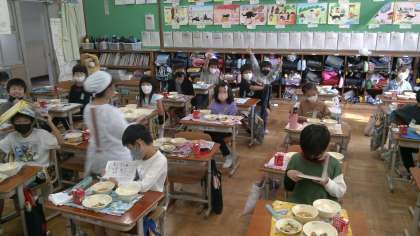 たくさん勉強して、たくさん遊んだのでお腹が減った子どもたち。待ちに待った給食の時間となりました。