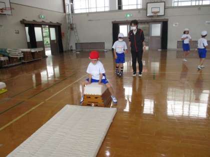 今日は1回目の跳び箱ということで、2段〜5段で自分の跳べそうな高さに挑戦しました。