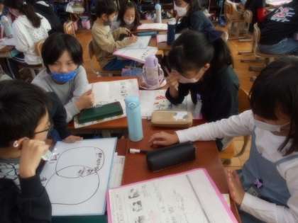 家庭科では、「買い物をするときに気を付けること」についてベン図を使って話し合いました。