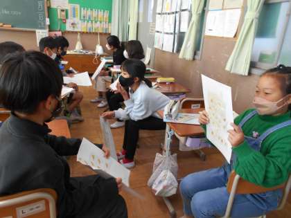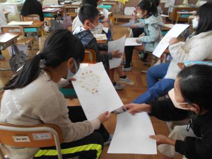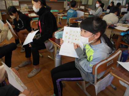 前の時間に、友達と果物カードをやりとりして、オリジナルのパフェを作った子ども達。
