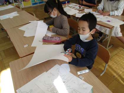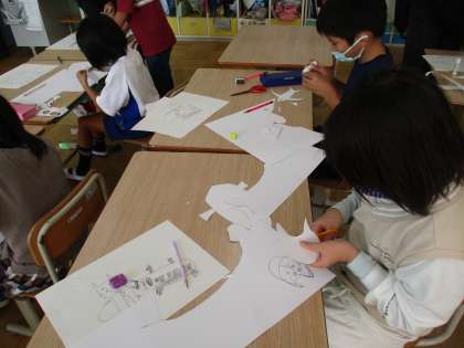 自分が乗ってみたい乗り物を想像して、紙に下描きをし、画用紙で版を作り始めました。