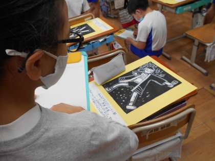 2学期に取り組んだ木版画の鑑賞をしました。