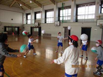 1人で上に投げてキャッチ、2人で相手が取りやすい球でキャッチボール、みんなで息を合わせてボールキャッチなど様々な技に挑戦しています。
