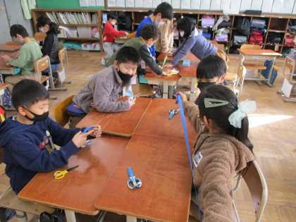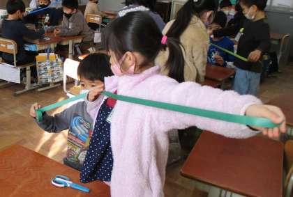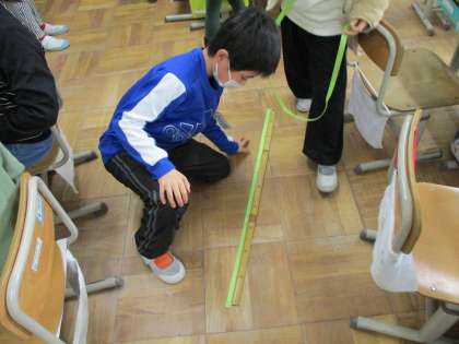 とわいわい言いながら紙テープを1mだと思うところで切っていました。
