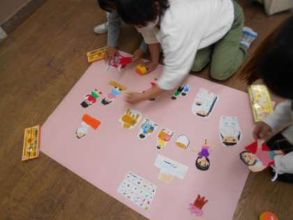 新しい1年生を迎えるための教室のかざりを一生懸命作っています。