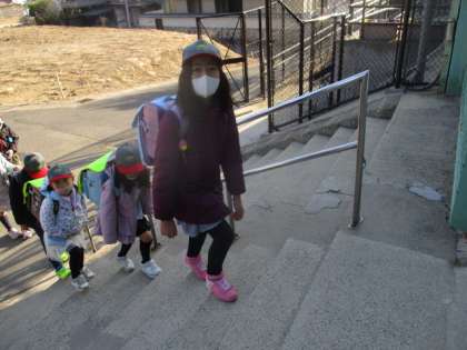 今までお世話になった6年生に感謝の気持ちを伝え、新しく登校班長として5年生が今日から頑張りました。