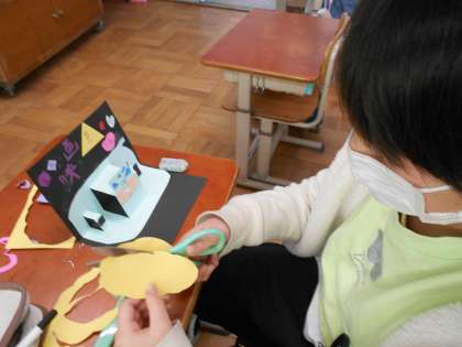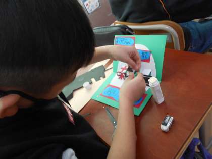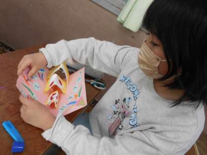 図画工作で、飛び出す仕組みをつかったカードをつくっています。