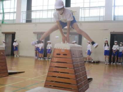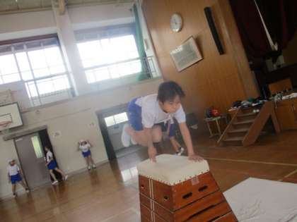 縦の抱え込み跳びがなかなか難しく、先生がお手本を見せてくれました。そのお手本を見て、